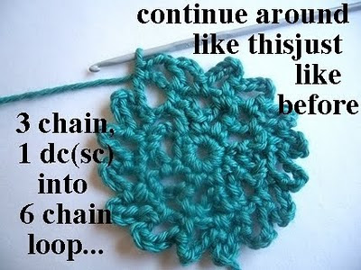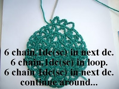 3 ch, 3 treble in next space, 1ch, 3 treble in next space...